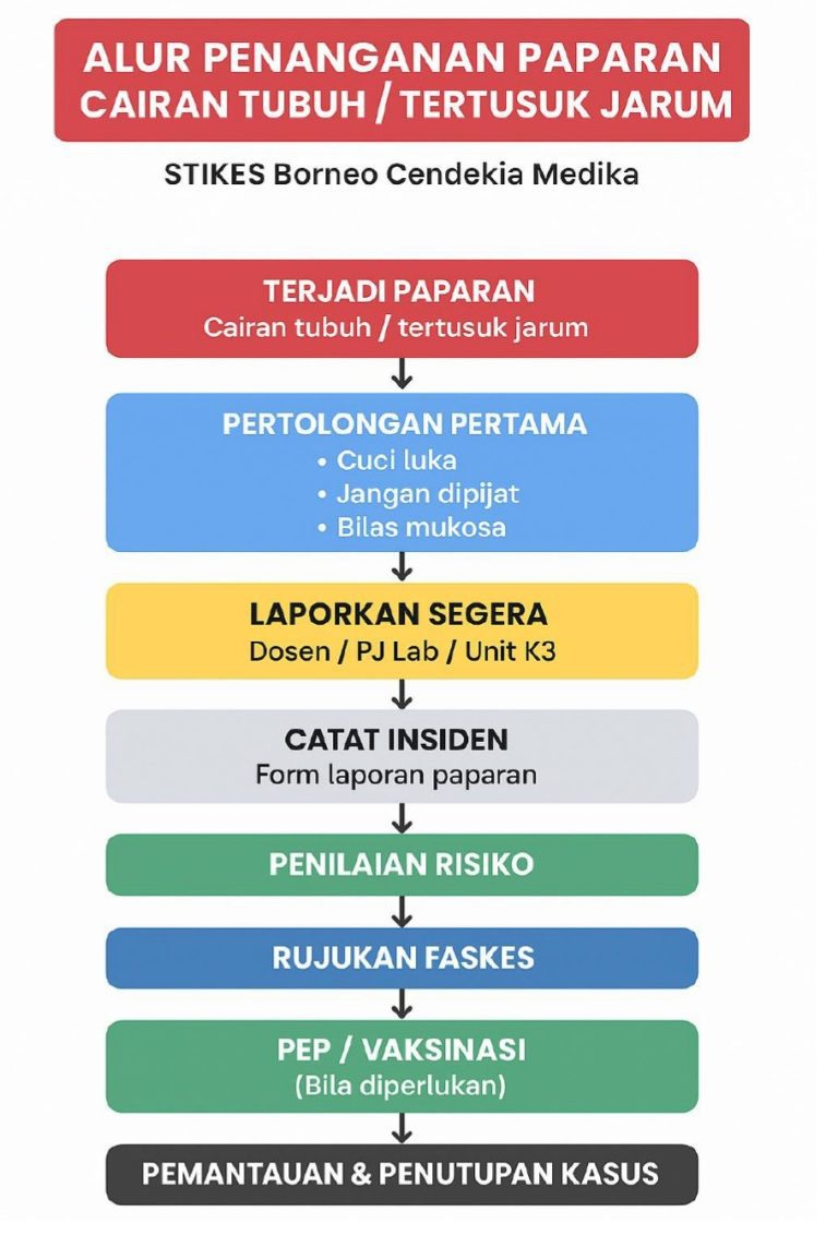 STIKES Borneo Cendekia Medika berkomitmen menciptakan kampus yang aman, sehat, dan nyaman bagi dosen, tenaga kependidikan, dan mahasiswa. Penerapan K3 dilakukan melalui pencegahan risiko, edukasi keselamatan, serta alur penanganan kejadian yang jelas—mulai dari pertolongan pertama, pelaporan, hingga tindak lanjut oleh Tim K3. Dengan budaya keselamatan yang kuat, seluruh aktivitas pembelajaran dan praktik berjalan lebih aman dan berkualitas.